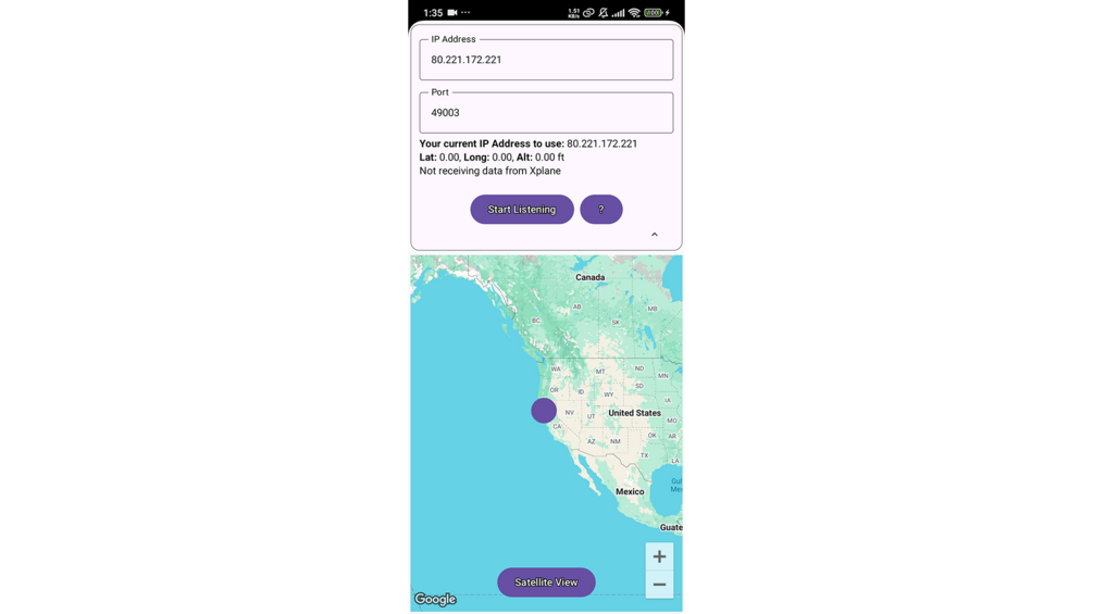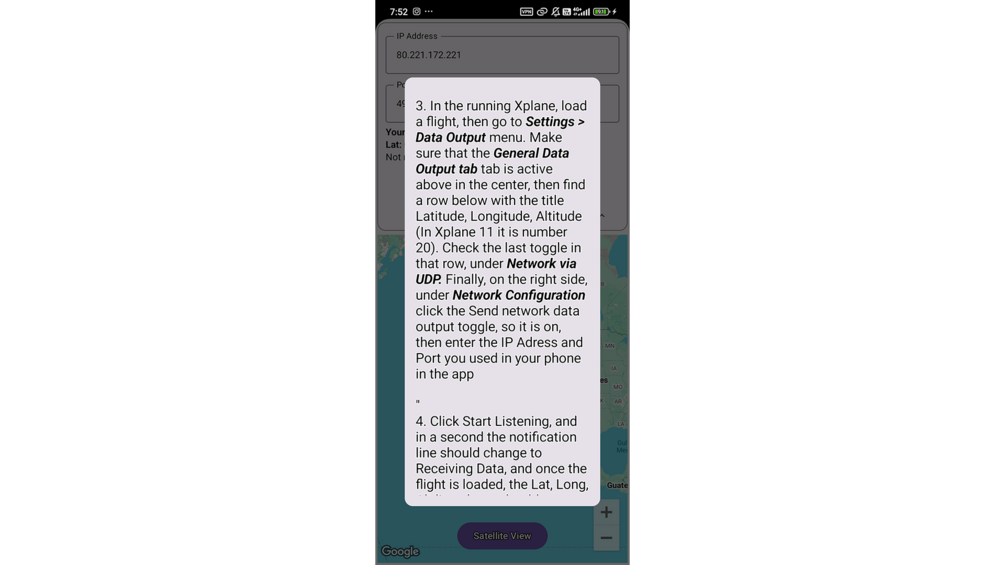 - The app has an Info and Help screen with detailed instructions. In general, the android phone running the app and the PC running XPlane must be in the same network (Simply put, using the same WiFI). XPlane must be set to send the "Location and altitude" data as UDP to the network. ( General Settings > Network Output section, where you also add the IP Adress of your android device, and a port to use. The IP Adress is automatically detected in the app for ease of use, and a port is also set up - all in all, the one-time setup takes seconds and is convenient)
