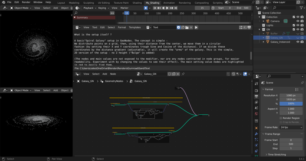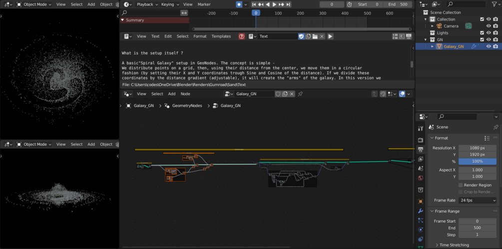 A spiral galaxy generated by Geometry Nodes. Distributed points are moved spherically by their distance and then adjusted by a distance gradient to create the "arms" of the galaxy.